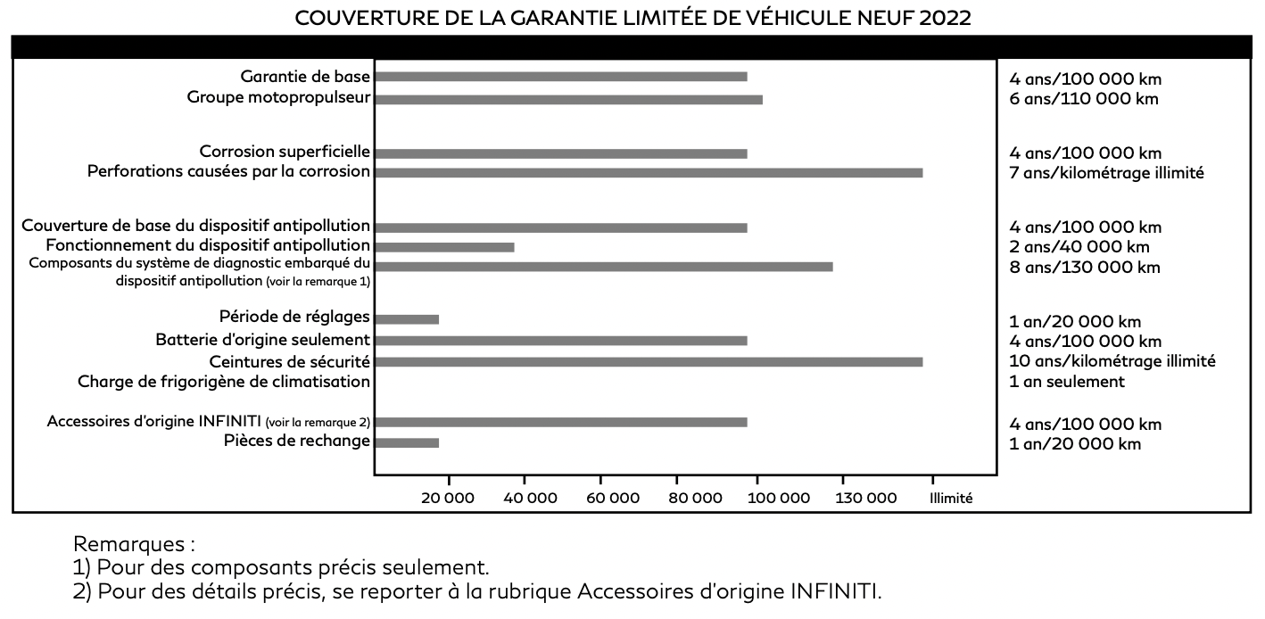 INFINITI, une division de Nissan Canada inc., située au 5290 Orbitor Drive, à Mississauga (Ontario) L4W 4Z5, garantit quetoute pièce ou tout composant de chaque véhicule neuf INFINITI fourni par INFINITI, qui présente un défaut de matériau ou defabrication, sera réparé par un concessionnaire INFINITI agréé pour les périodes et les conditions de garantie décrites ci-après.