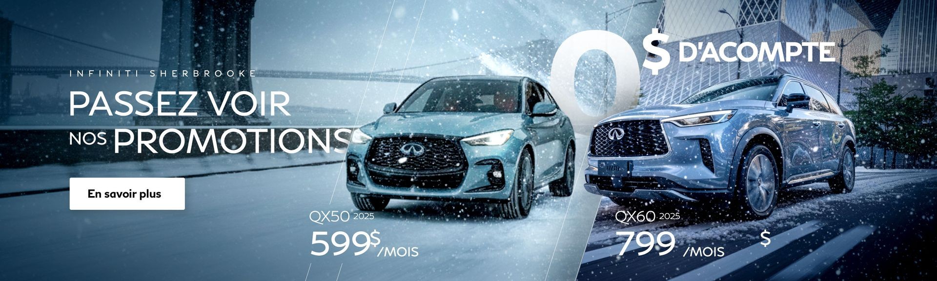 Que vous soyez à la recherche d'un véhicule d'occasion Infiniti, d'une berline à vendre à Sherbrooke ou d'un multisegment (VUS) des plus fiables et économiques, Infiniti de Sherbrooke pourra vous aider à trouver ce qu'il vous faut.