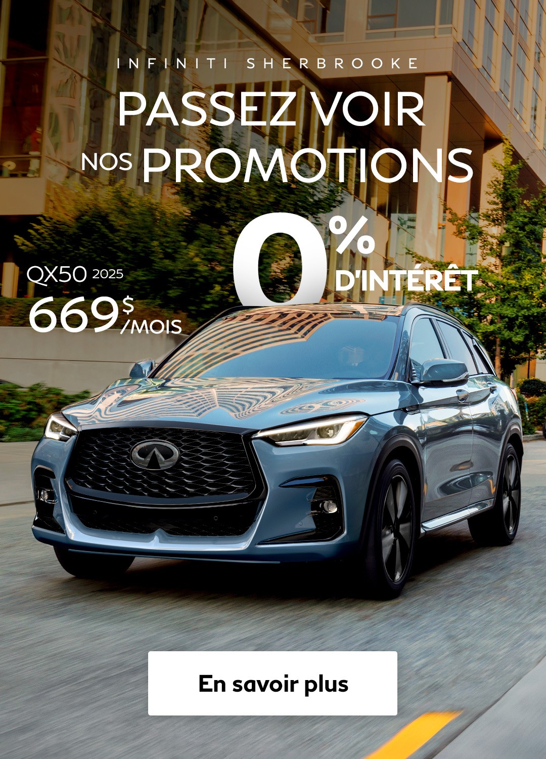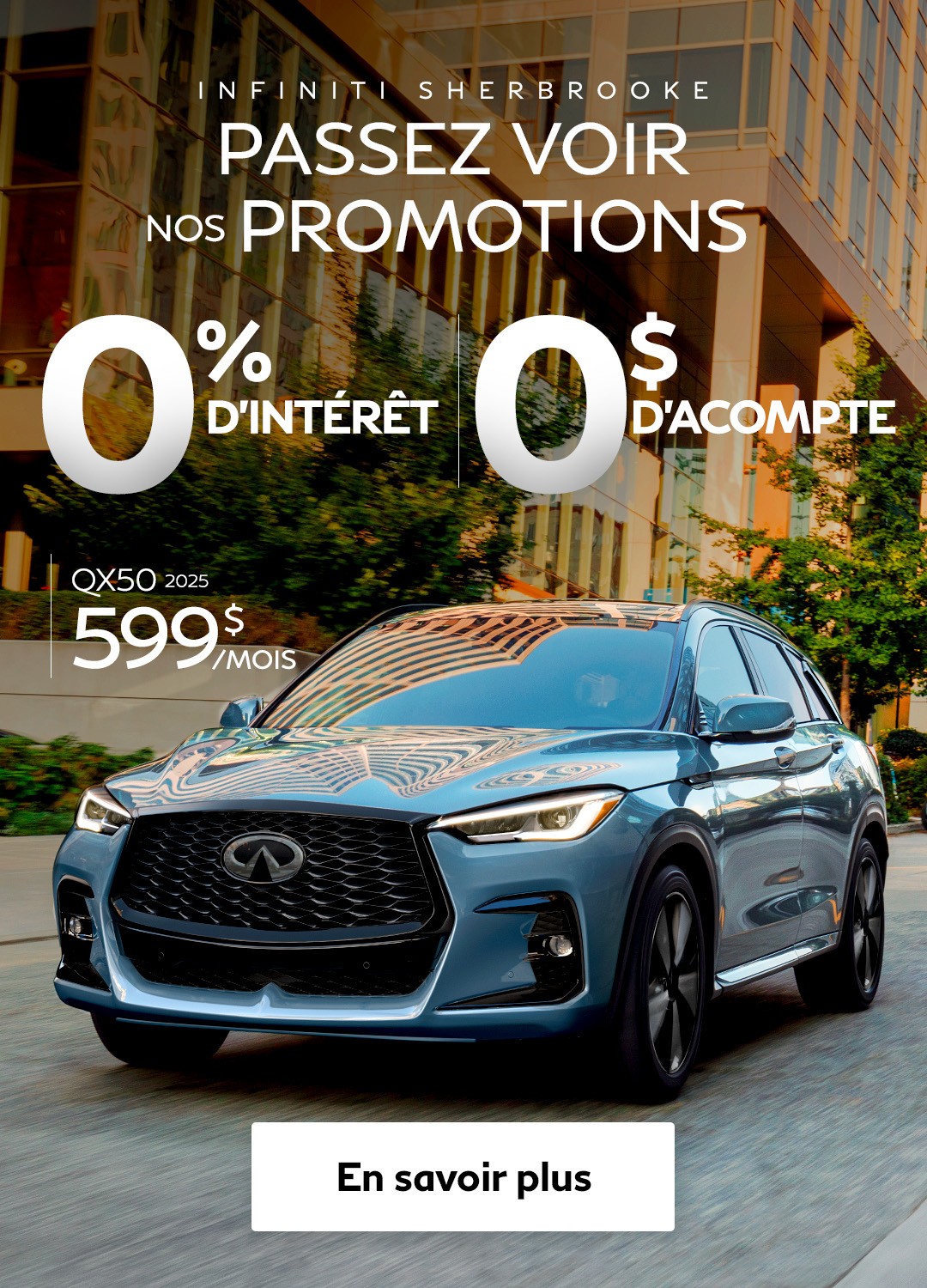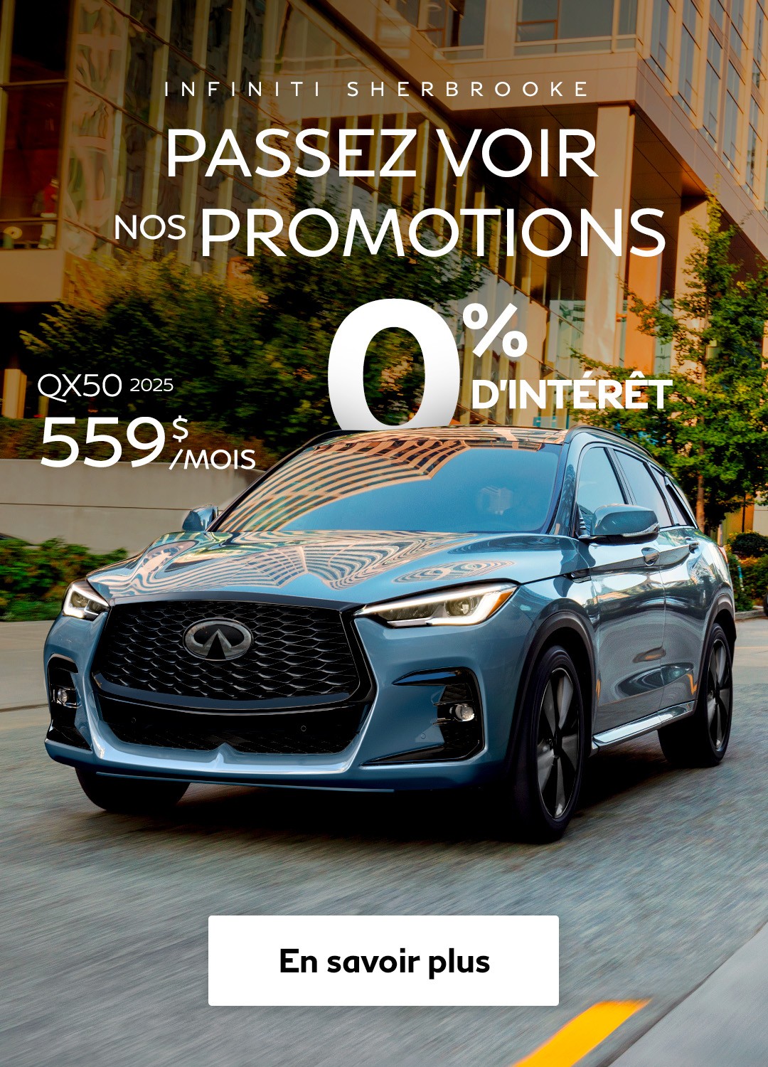 Que vous soyez à la recherche d'un véhicule d'occasion Infiniti, d'une berline à vendre à Sherbrooke ou d'un multisegment (VUS) des plus fiables et économiques, Infiniti de Sherbrooke pourra vous aider à trouver ce qu'il vous faut.