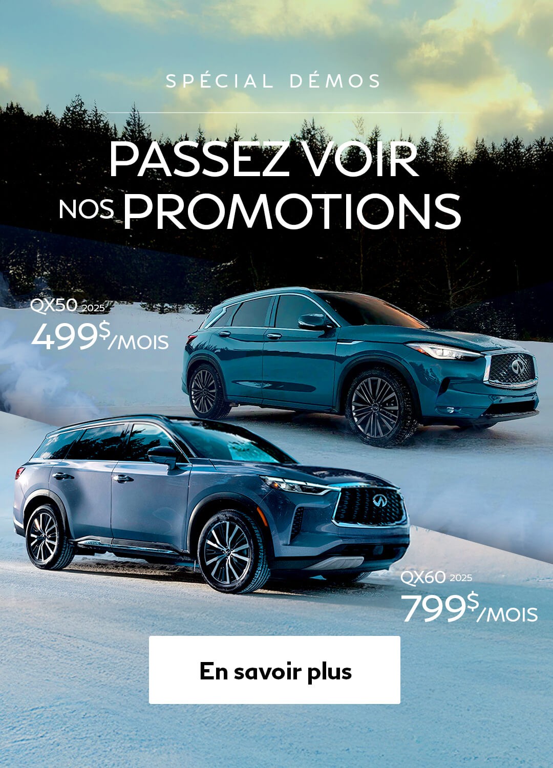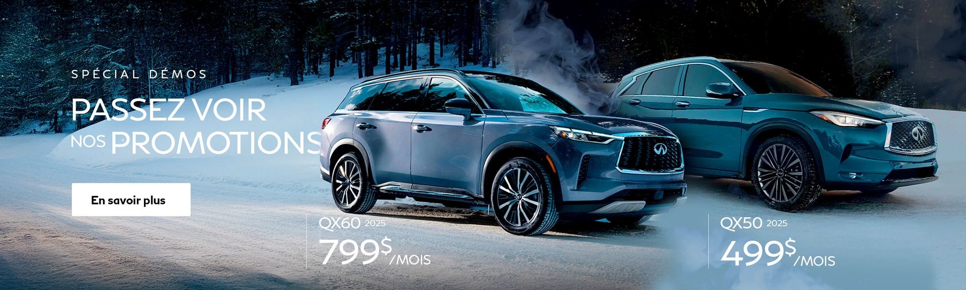 De plus, profitez de nos avantageuses promotions et de nos options de financement, ou encore de nos différents termes de location Infiniti!