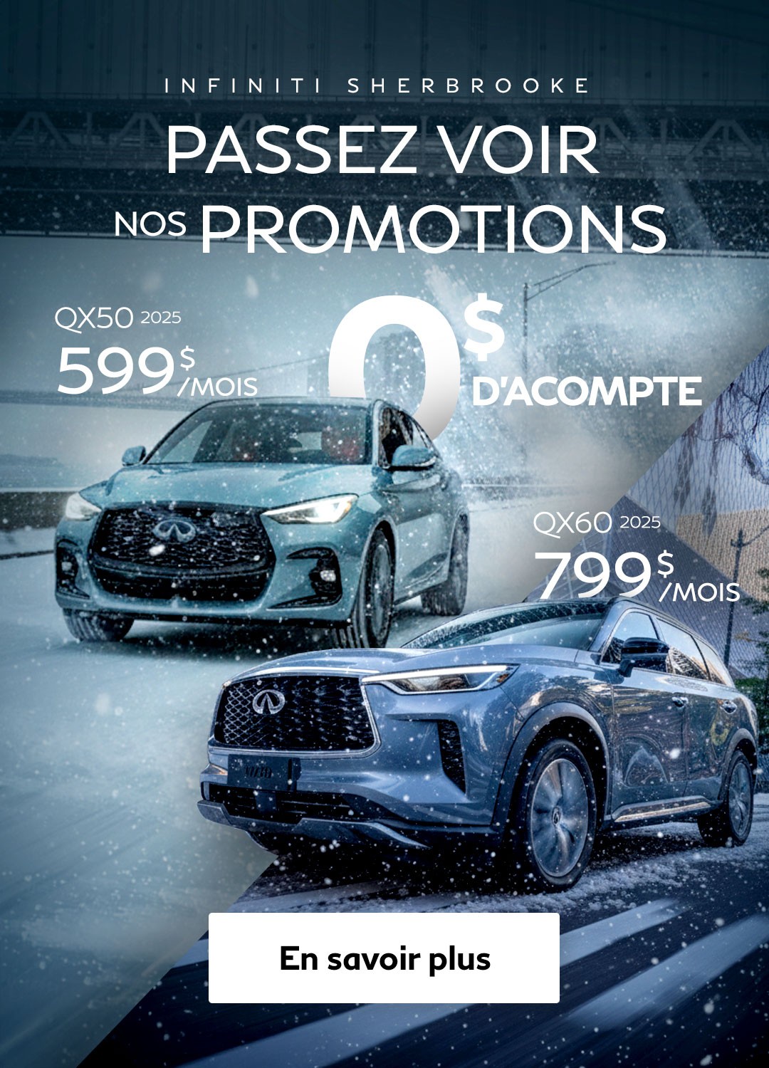 Que vous soyez à la recherche d'un véhicule d'occasion Infiniti, d'une berline à vendre à Sherbrooke ou d'un multisegment (VUS) des plus fiables et économiques, Infiniti de Sherbrooke pourra vous aider à trouver ce qu'il vous faut.