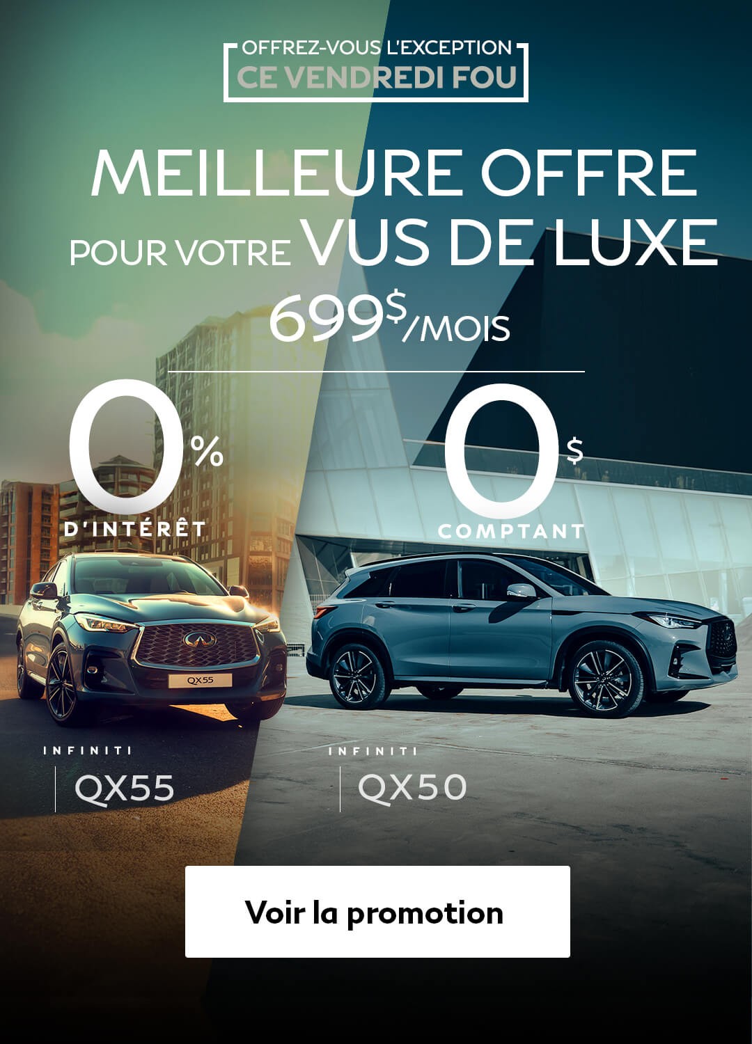 Si vous êtes à la recherche d’un VUS Infiniti, vous aurez l’embarras du choix parmi nos différents modèles neufs et d’occasion. Du populaire QX50 2023, en passant par le spacieux QX60 2023 et ses 3 rangées de sièges, la gamme de VUS que vous trouverez chez votre concessionnaire Infiniti répondra aux besoins de chaque acheteur.